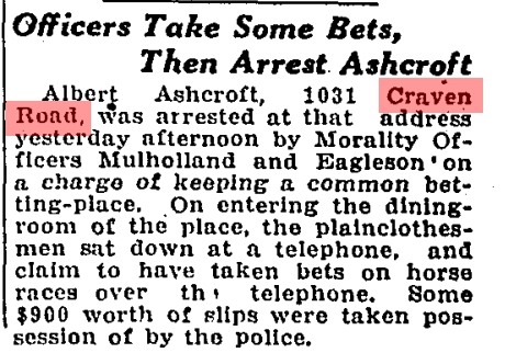 1031 Craven Road Globe, Oct. 22, 1926 Craven Road seems to have had an unusually large number of bookies and bootleggers. I have only included a few examples of the criminal activity reported but it would be fair to say that Craven Road’s reputation wasn’t entirely unearned.