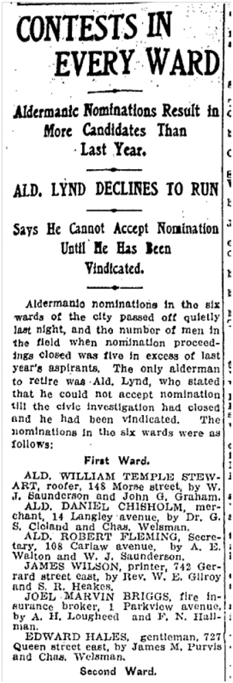 Previous Image Next Image 148 Morse Election candidates Alderman Toronto Star Dec. 23, 1905 148 Morse St., Toronto Star, Dec. 23, 1905
