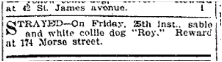 Previous Image Next Image 174 Morse 19040328TS Missing Collie 174 Morse St. Toronto Star, March 28, 1904