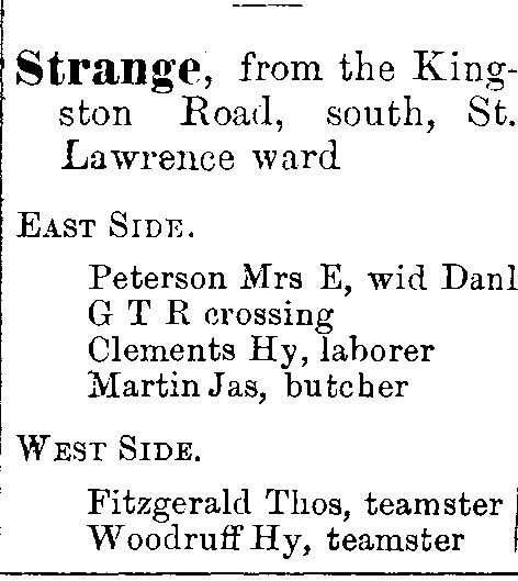Previous Image Next Image 1878 City of Toronto Directory Strange St 1878 City of Toronto Directory Strange Street (Strange Street south of the railway track became Dibble Street)