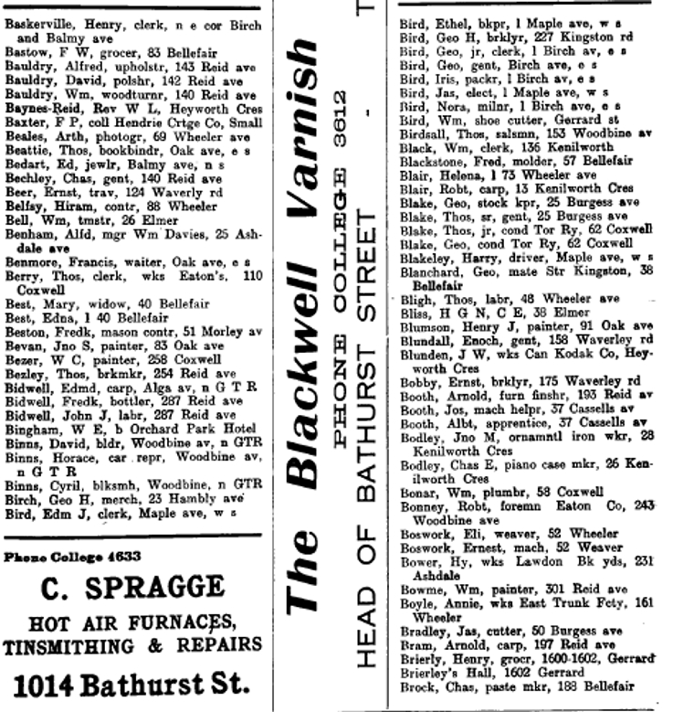 More streets: Alga Ave., Balmy, Elmer, Heyworth Crescent, Maple Ave., Morley Avenue (now Woodfield Rd.), Small (now Eastwood), and the Orchard Park Hotel.