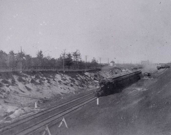 1909, Grand Trunk Railway, International Flyer running between Montreal & Chicago; looking east between York Station & Woodbine Avenue, Toronto Public Library