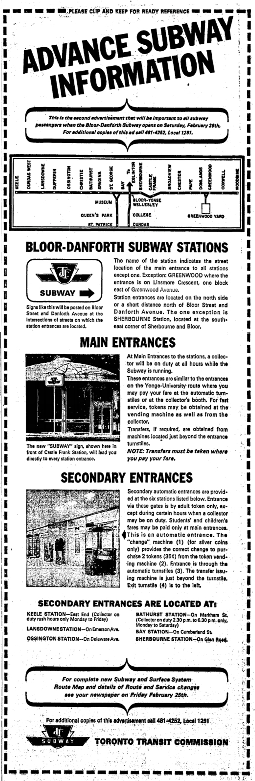 Previous Image Next Image 19660222TS New subway stops Toronto Star, February 22, 1966 Advance Subway Information regarding the new Bloor-Danforth Subway Stations