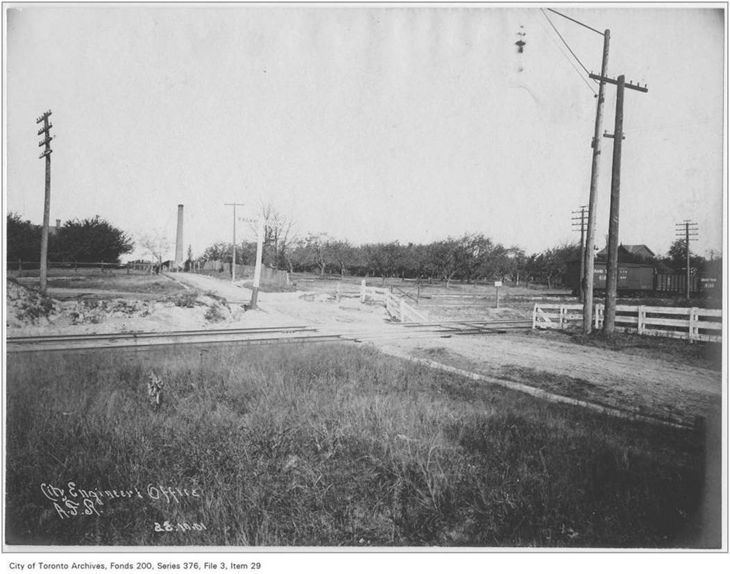 Looking north east Greenwood Avenue Orchard and Logan’s Brickyard Chimney, 1901. This was before Greenwood’s Lane was widened to become Greenwood Avenue.