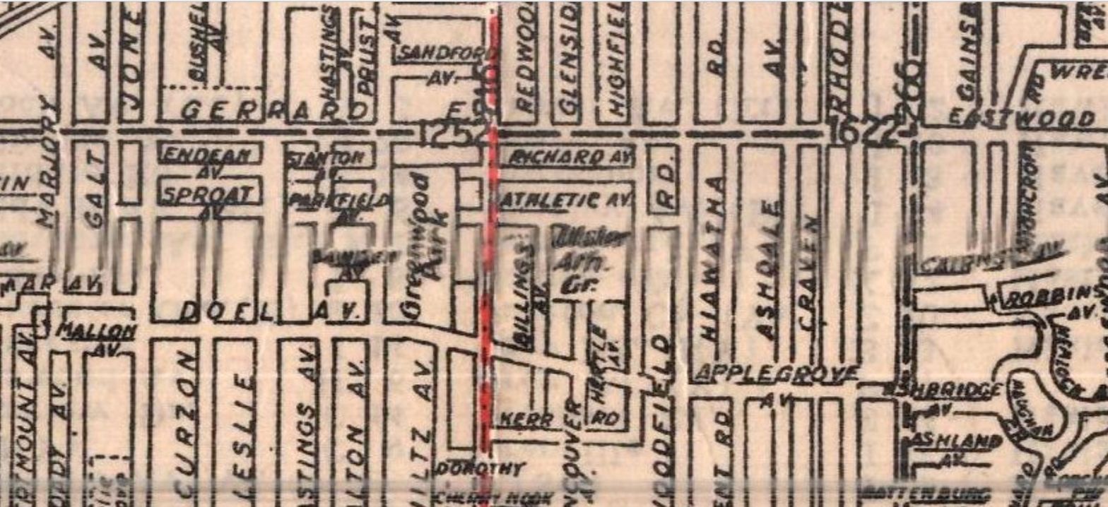 What happened? How can a street be lost? Let’s go back to the beginning, around 1909 when Applegrove Avenue was a short street running from Morley Avenue, now Woodfield Road, to Ashdale Avenue — a mere two blocks. It ran through the Ashbridge’s large apple orchard, giving an obvious reason for the street name. ApplegroveContinue reading “A Lost Street: Applegrove Avenune”