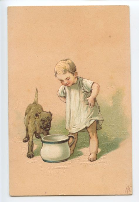 Child, dog and chamber pot. Chamber pots were also known as piss pots, pee pots, potties, thunder pots and thunder mugs.