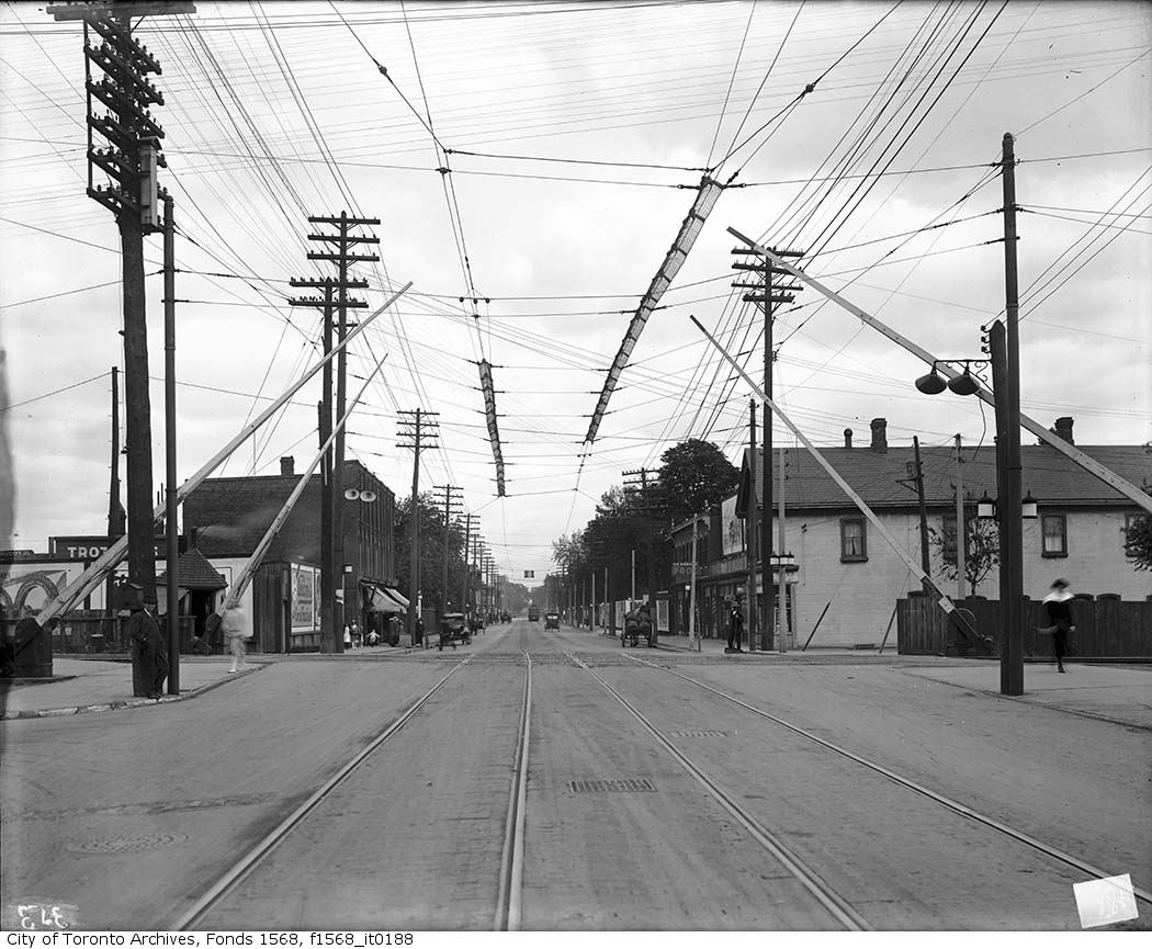Previous Image Next Image Level railway crossing with trolley guard, Queen Street East between Degrassi and McGee streets ca 1915
