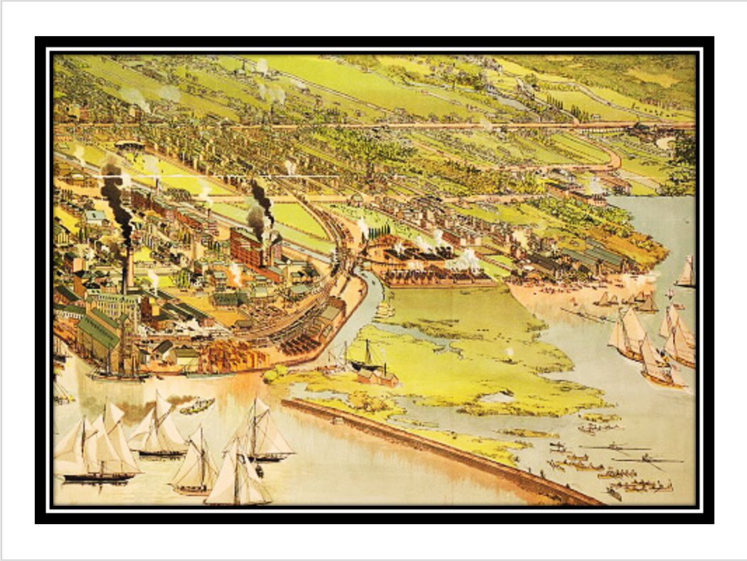 1893 Barclay, Clark & Co. Bird’s Eye View Chromolithograph. Detail of Toronto’s East End showing the industrialization at the mouth of the Don and along Eastern Avenue.