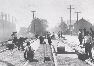 Installing wood block pavement. The pounder is the post in the foreground. From http://kaswell.com/site2/history-of-woodblock/