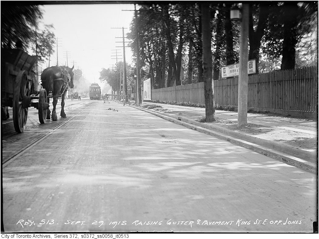 Raising gutter & pavement Queen St. east opposite Jones (George Leslie’s Toronto Nurseries on right)