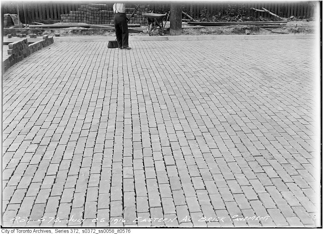 Specially manufactured clay brick was also used on many local streets. It was more durable than wood. Locals used to steal the wood blocks and use them for fuel in their stoves, creating many broken roads full of pot-holes. Eastern Ave. – brick pavement