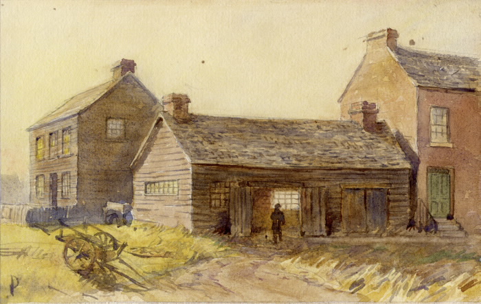 Richmond’s Blacksmith Shop, Queen St. W., north-east corner Simcoe St. By Frederic Victor Poole, 1912. From The Toronto Public Library Digital Archives.