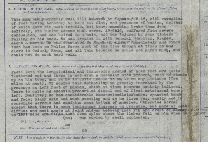 John Christopher Waldron married William Robertson Hodge’s sister Eveleen in 1919 and was lived with her, sister Jean, and their mother, Mary. Like his brother in law he was a tall man for the time (5’11”) and fit. He was an Irish Catholic while Eveleen Hodge was an Irish Protestant. Both were from Dublin. Unlike his brother-in-law, he was not conscripted but volunteered. Like his brother-in-law he was hit by shellfire. Clearly from the medical records doctors had a hard time identifying just what was wrong with Pte. Waldron, apart from flat feet which was easy. The blast buried Waldron completely under mud, timbers and rubble, causing a severe concussion and what was known as “shell shock “. He died in 1964.