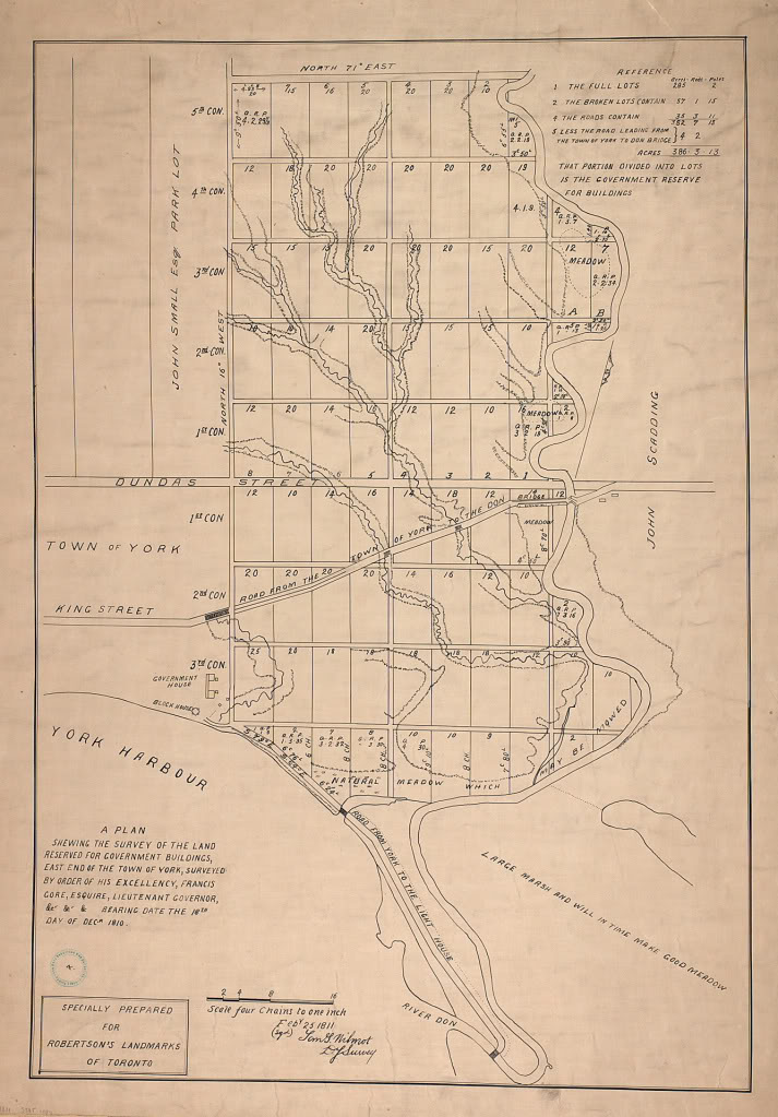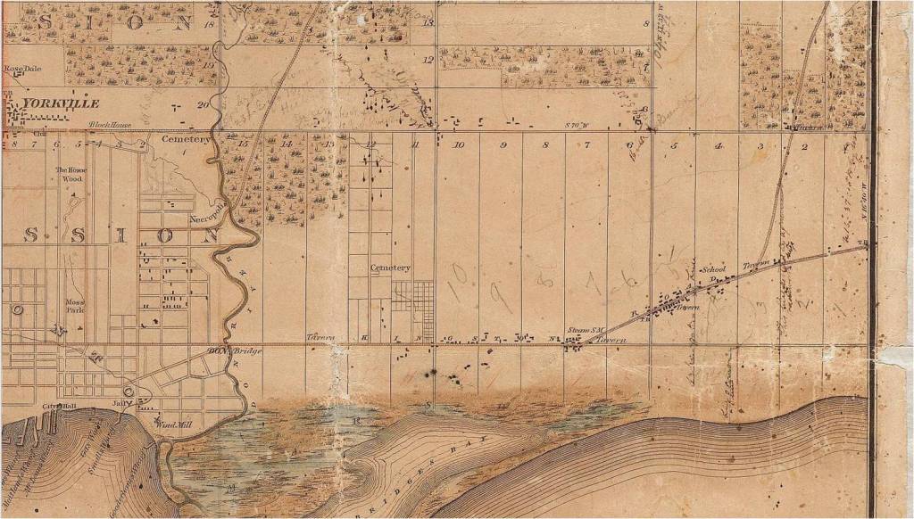1802 Chewitt mapdetail 1802 Chewitt map (digitally enhanced)A new map of Upper and Lower Canada, 18071810 Map of Don River and nearby creeks181118131813 Sketch of the ground in advance of and including York, Upper CanadaYork, 18141817 Plan of YorkPlan of the Town of York, 1818, unknown 18191833 Bonnycastle No.1 Plan of the Town and Harbour of York1834Toronto in 1834183718431846 Holloway map184618511851 Detail showing the subdivision near the Leslie Street School1857Boulton, W. S. Atlas of the City of Toronto and Vicinity, 1858 detail1860 Tremaine map of Leslieville and Beach1868