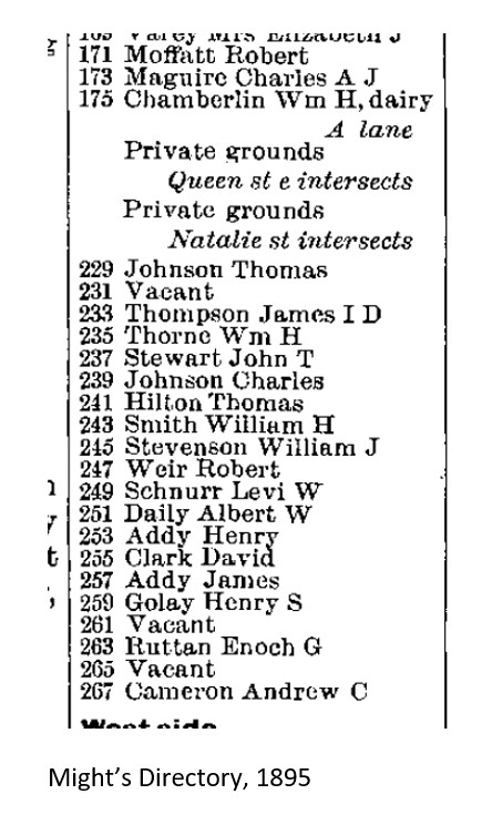 In February 1888 the City of Toronto decided to build a sewer from Natalie to Paisley (Jemima) on Booth. By May of 1888, construction of the Russell Terrace on Logan, Natalie and Booth was under way. “There are upwards of 100 houses now under construction on the lots we have already sold” (Globe 24 May 1888) These were free-hold properties.