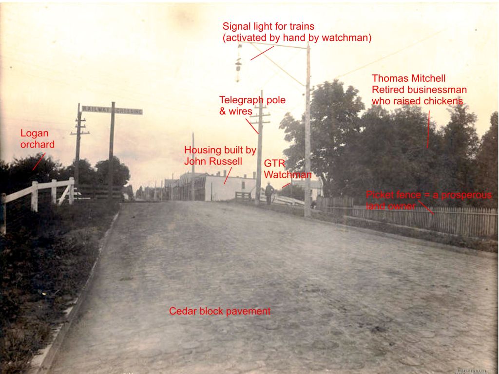When I looked at the photo in high resolution it was clear that Logan Avenue was paved with cylindrical cedar blocks. Cedar is rot-resistant but broke down over time and the heavy loads of bricks that horses hauled over the blocks. The ruts are visible in the picture.