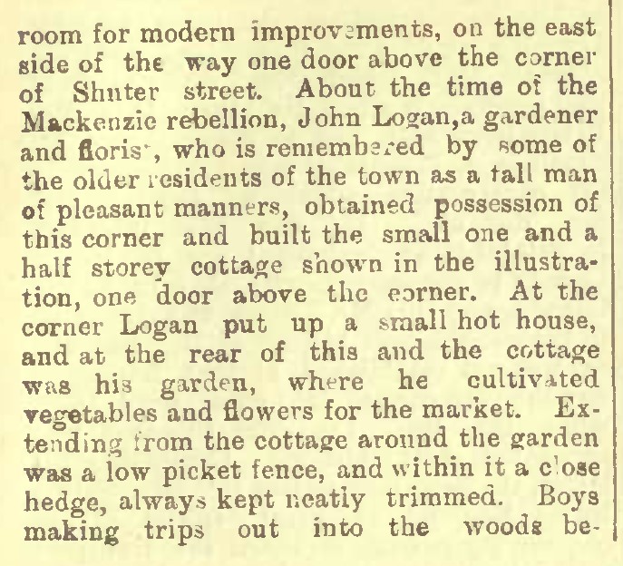 Leslieville gardener, John Logan, (Logan Avenue is named after his family) was active in the City of Toronto Horticultural Society After John Logan Sr. died, his wife Elizabeth (1828-?) continued the market gardening business with the help of daughter Annie and sons William, George and John who became a brick manufacturer on Greenwood Avenue. They also owned a cottage downtown which Elizabeth operated as a store, selling their produce. John Logan, a tall shy man, preferred to look after the gardening, leaving his wife to handle the customers. John Ross Robertson describes the Logans in his Landmarks, Vol. 1, p. 126-127. What he doesn’t mention is that John Logan was instrumental in making Leslieville a welcoming place for refugees from slavery.