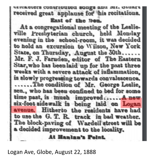 In June the City of Toronto called for tenders to pave Logan Avenue with cedar blocks from Queen to Gerrard. Globe June 27 1888. By August John Poucher was offering “Semi-detached, brick-fronted, six-room houses, east end” for $750 and still selling lots. (Globe Aug 11 1888) John Love was a well known contractor and may have been the builder. In September, sidewalks went on Booth (now formerly Bangor) to Paisley (formerly Jemima).