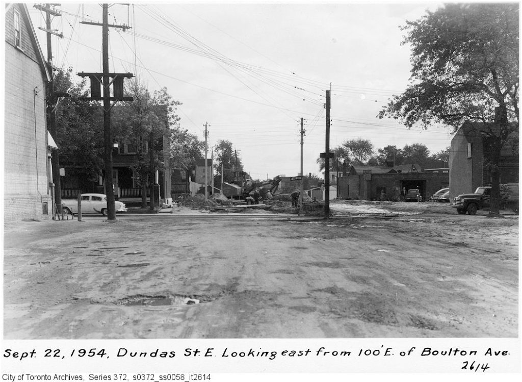 Dundas Street East looking east from 100′ west of Broadview Avenue – September 22, 1954Dundas Street East looking east from 25′ west of Boulton Avenue – September 22, 1954Dundas Street East looking east from 100′ east of Boulton Avenue – September 22, 1954Dundas Street East looking east from 150′ east of DeGrassi Street – September 22, 1954Dundas Street East looking east from opposite 884 – September 22, 1954Dundas Street East looking east from opposite 928 – September 22, 1954