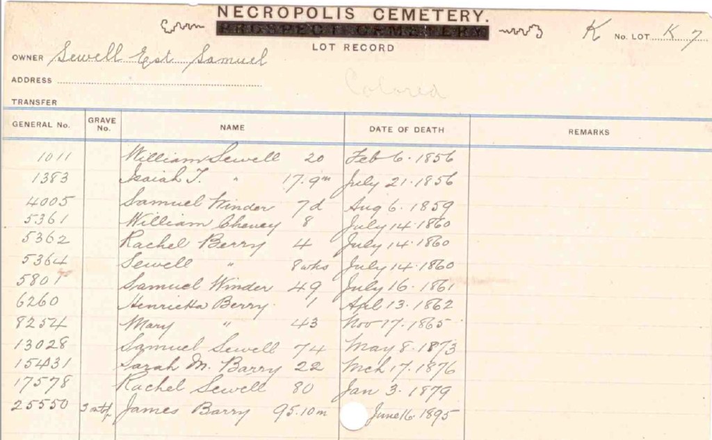 Samuel and Rachel Sewell were gardeners and breeders of horses near Logan and Queen. Their farm lane became known as “Sewell’s Lane”, and later “Logan Avenue”. Sons William and Isaiah were born in the U.S. Son Samuel was born in Ontario. While Samuel Sewell Sr. claimed to have no religion in the 1851 Census, the rest of the Family was Baptist. Samuel Sewell Sr. was born in 1797 under slavery and died May 8, 1873. He could be said to be the patriarch of Leslieville’s black community. He is buried in the Necropolis Cemetery with his family. His wife Rachel died in 1879 and is buried beside him. Son William died early at the age of 15 on Feb. 6, 1856, from scrofula or tuberculosis of the glands of the neck. Daughter Maria Sewell married Samuel Winder (Widower) on Jan. 21, 1847.