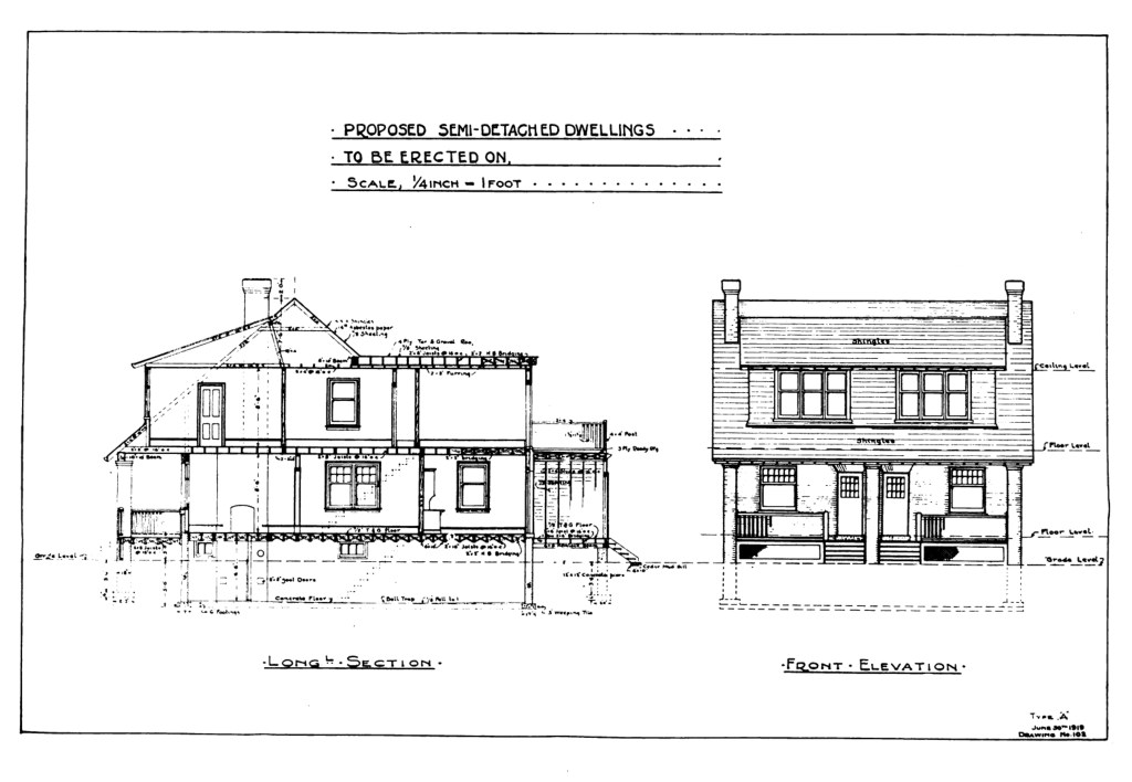“We were mostly building six roomed houses for working people and they were what we called the bungalow type, in other words their roof sloped right down and out the verandah and there were large peers and the roof made the shelter for the verandah and the verandah went right across the full width of the house and with the semi-detached … there was usually a little wooden partition in between just to give a little privacy.”