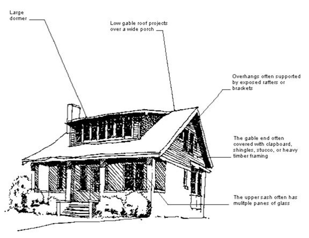 - Decorative knee braces (brackets) and protruding rafter ends or “rafter tails”