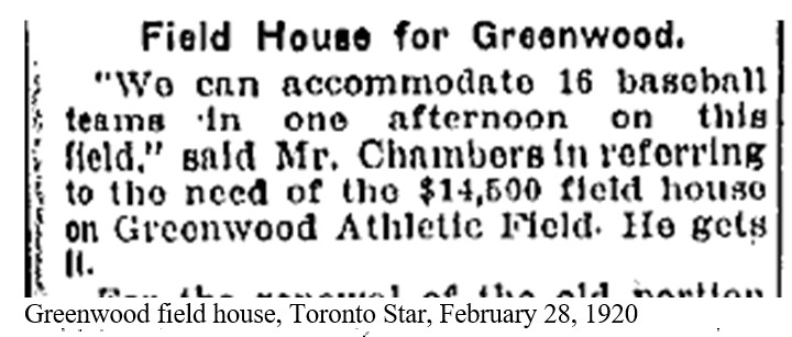 Greenwood field house, Toronto Star, February 28, 1920 Plan of new Greenwood Park, Toronto Star, May 6, 1920 Greenwood Park Shelter under construction, March 1, 1928Greenwood Park Shelter, April 17, 1928Greenwood Park 1947 aerial photoGreenwood Park, looking west 1986 Toronto Public Library