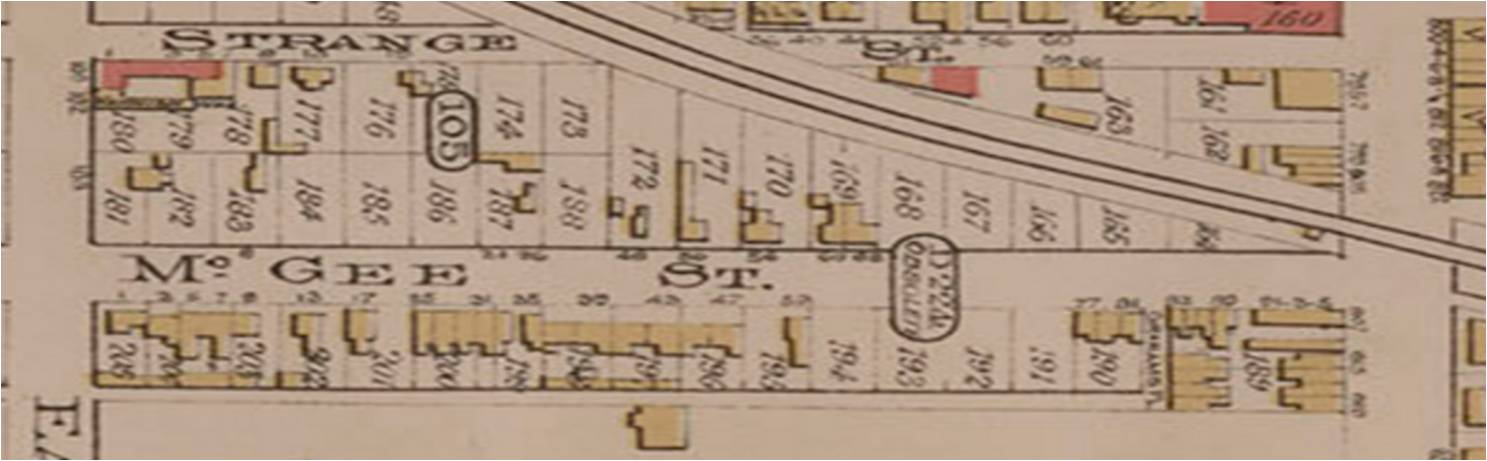 Goad’s Atlas, Plate 47, 1903 Close Up showing street numbers. 26 McGee is a wooden building with a barn or outbuilding at the back. (Brick buildings are pink, wooden buildings are brown.)