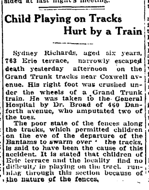 Previous Image Next Image 763 CR 19170427GL Child hurt on tracks 763 Erie Terrace Globe, April 27, 1917