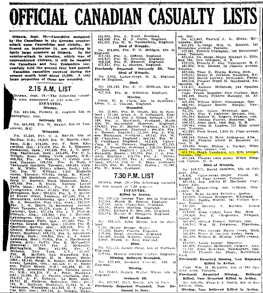 825 Erie Terrace Globe, September 30, 1916 After the Battle of Flers-Courcelette, the casualties covered pages of newspapers. For more info go to: http://www.warmuseum.ca/firstworldwar/history/battles-and-fighting/land-battles/courcelette/