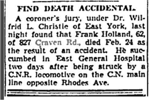 Previous Image Next Image 827 CR 19440421GM Killed by train 827 Craven Road Globe and Mail, April 21, 1944