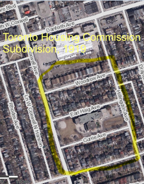 Map from the City of Toronto Interactive map Aerial 2015 with added highlights by Joanne Doucette. The map above shows The Toronto Housing Commission Subdivision in the Coxwell-Gerrard area. It covered the whole block of land between Coxwell and Hillingdon Avenue –from the Toronto Transit Commission’s property on Danforth Avenue to and including both sides of Hanson Street. The City of Toronto renamed part of Stacey Street after General Sir Earl Haig.