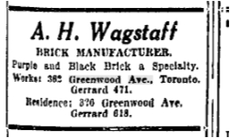 Albert Wagstaff was not an armchair boss or a white-collar man. He had worked in his father’s brickyard from a very young age and continued to do hard physical labour through most of his life. In June 1906 he was working in his brickyard on Greenwood Avenue north of the railway line when he lost his balance and fell. The heavy post he was carrying toppled on top him causing internal injuries and damaging his shoulder. He was living at 40 Jones Avenue at the time, not far from his childhood home where Bertmount Avenue (named for him) is today. (Toronto Star, June 17, 1905)