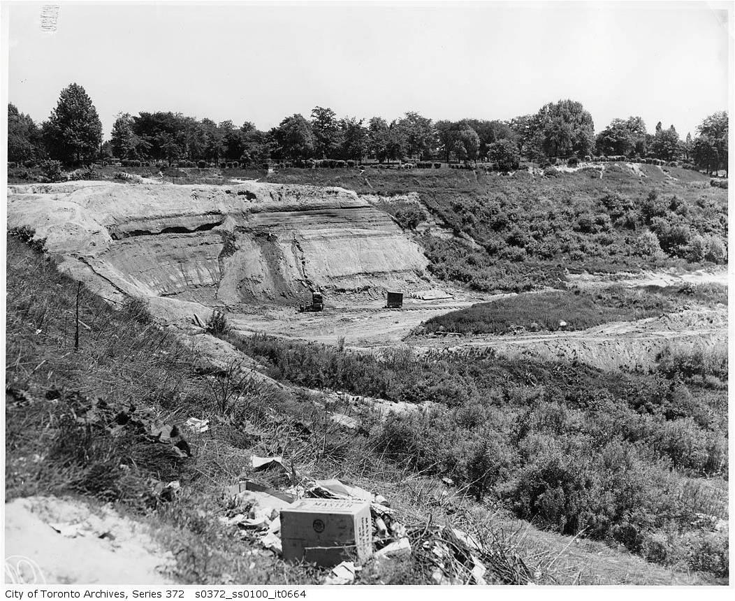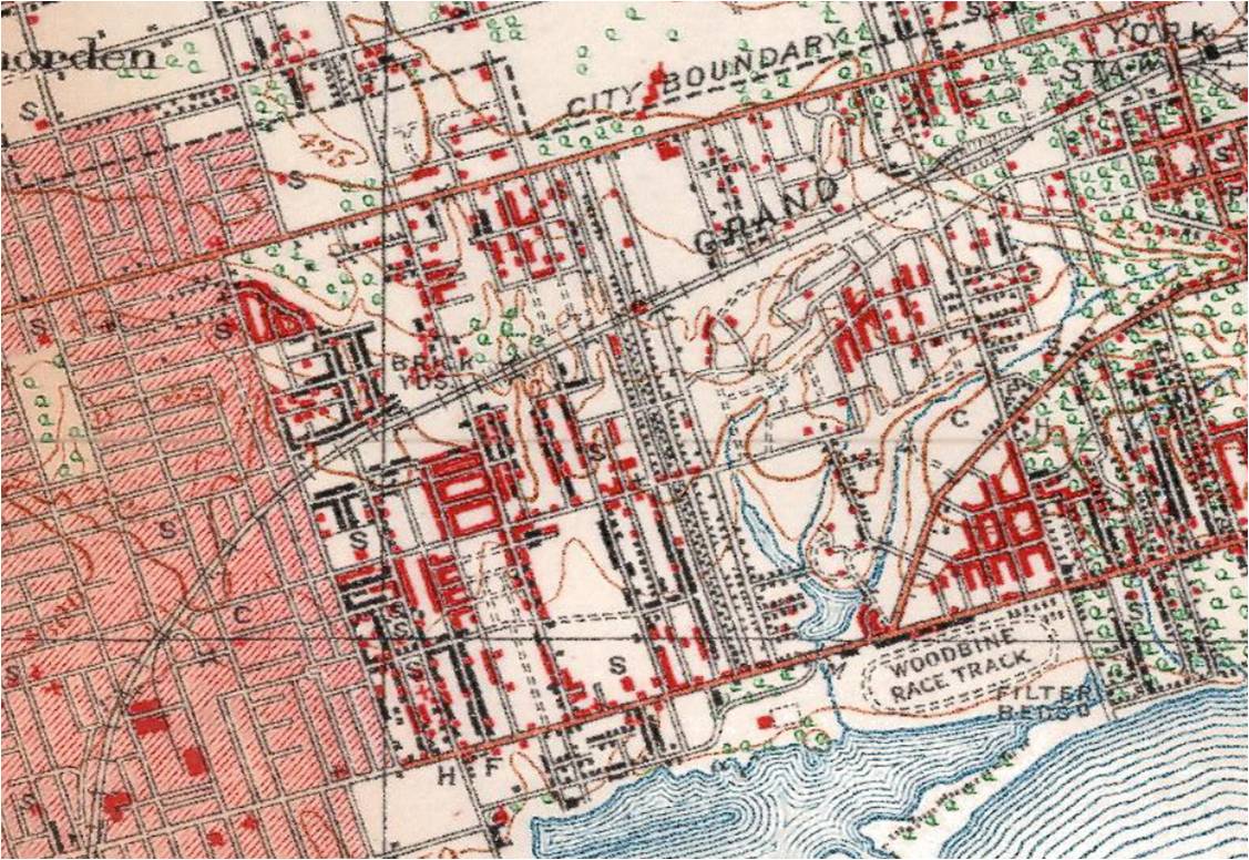 The brick pits on the west and east side of Greenwood park are clearly visible as well as a smaller brick pit on Coxwell Avenue north of the CNR line. Monarch Park is sandwiched between two former brick pits. The areas at the tops of all the streets east of Greenwood(Redwood, Highfield, Woodfield, Hiawatha, Craven and Rhodes) and south of the rail line were also brick pits, small but deep. Glenside Road was also a brick pit. Other small brick pits were scattered through the immediate area. The Devil’s Hollow from the rail line south to Gerrard was one big brick pit. Greenwood Park is built on a southern extension of the Devil’s Hollow brick pit.