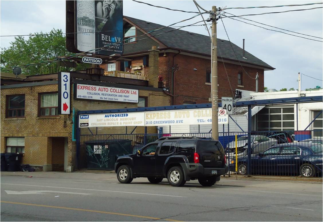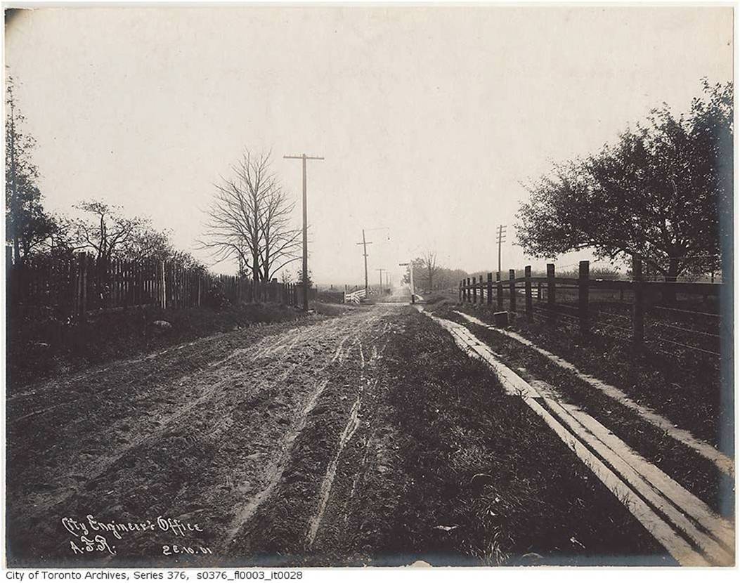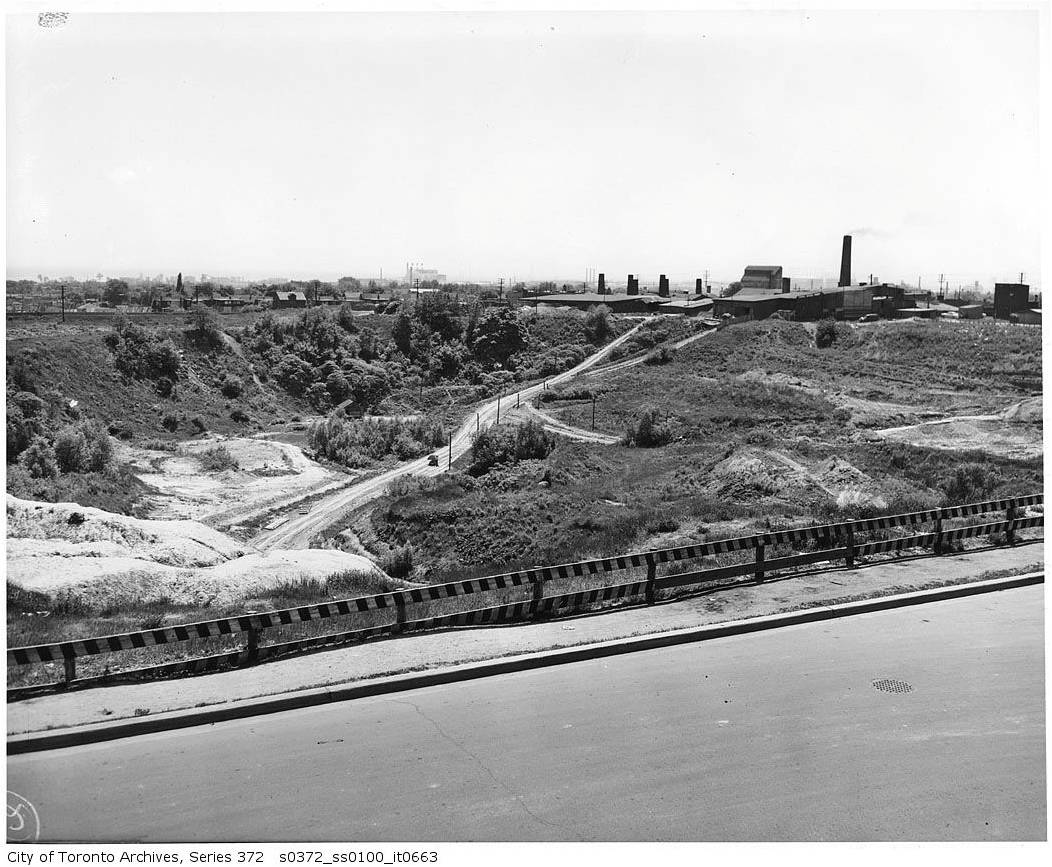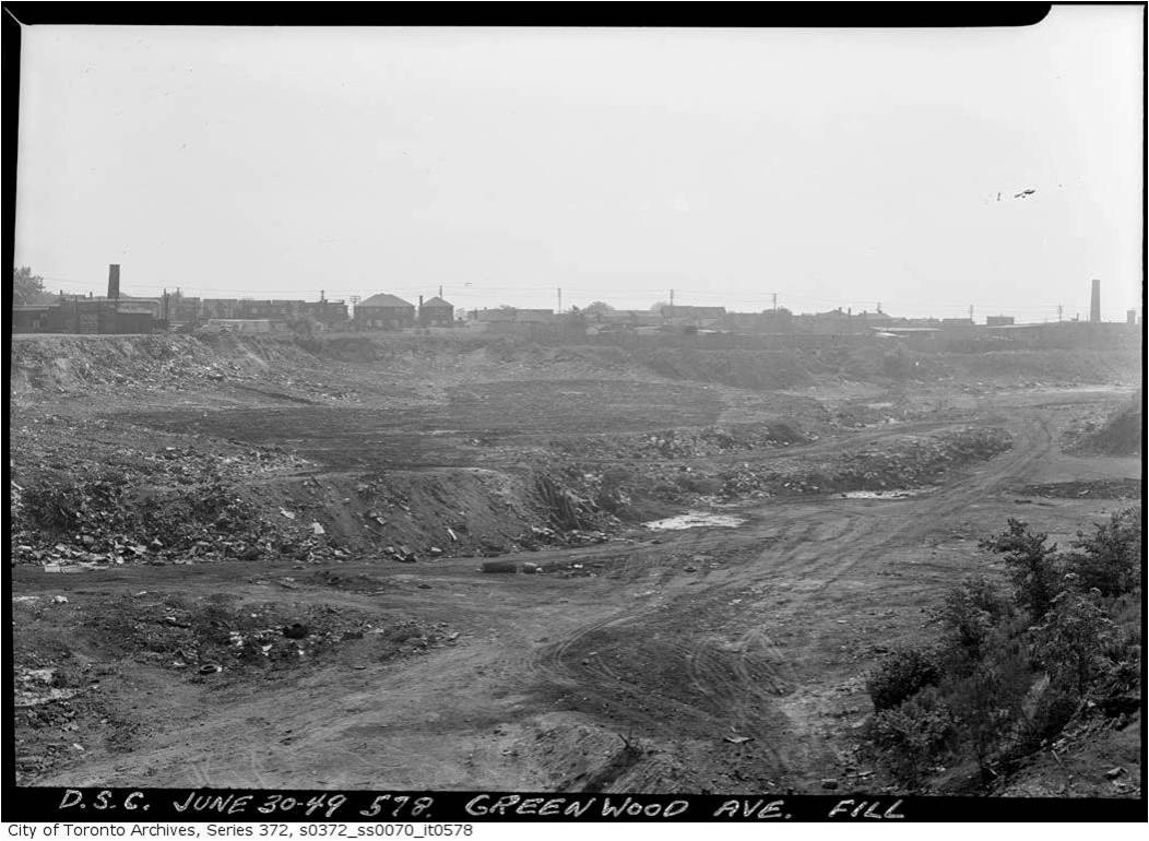 “On both sides of Greenwood were brickyards, and we used to play there weekends. The west one is now T.T.C. yards, and the eastern section is now a subdivision of houses. I have sometimes wondered whether the eastern one (which is built on landfill), since it was a deep hole, extending nearly over to the fence at Monarch Park, would find any of the houses sinking. They had a narrow rail line going down into the hole, where they let down a small dump car [dinky] to haul up the clay for their bricks.”