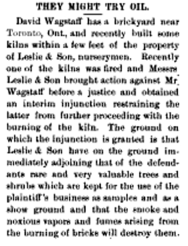 The Wagstaff boys had worked from a very early age in the brickyards. By 1851 David was living with his mother and stepfather in Leslieville and probably working in Robert Reid’s brickyard with his brothers. David and his brothers were tough men who occasionally got into trouble with the law for assaulting police and roughing up other people, as well as abusing their teams of horses. One brother, Robert, was part of the notorious Brook’s Bush Gang of thugs and murders that haunted Withrow Park’s area.