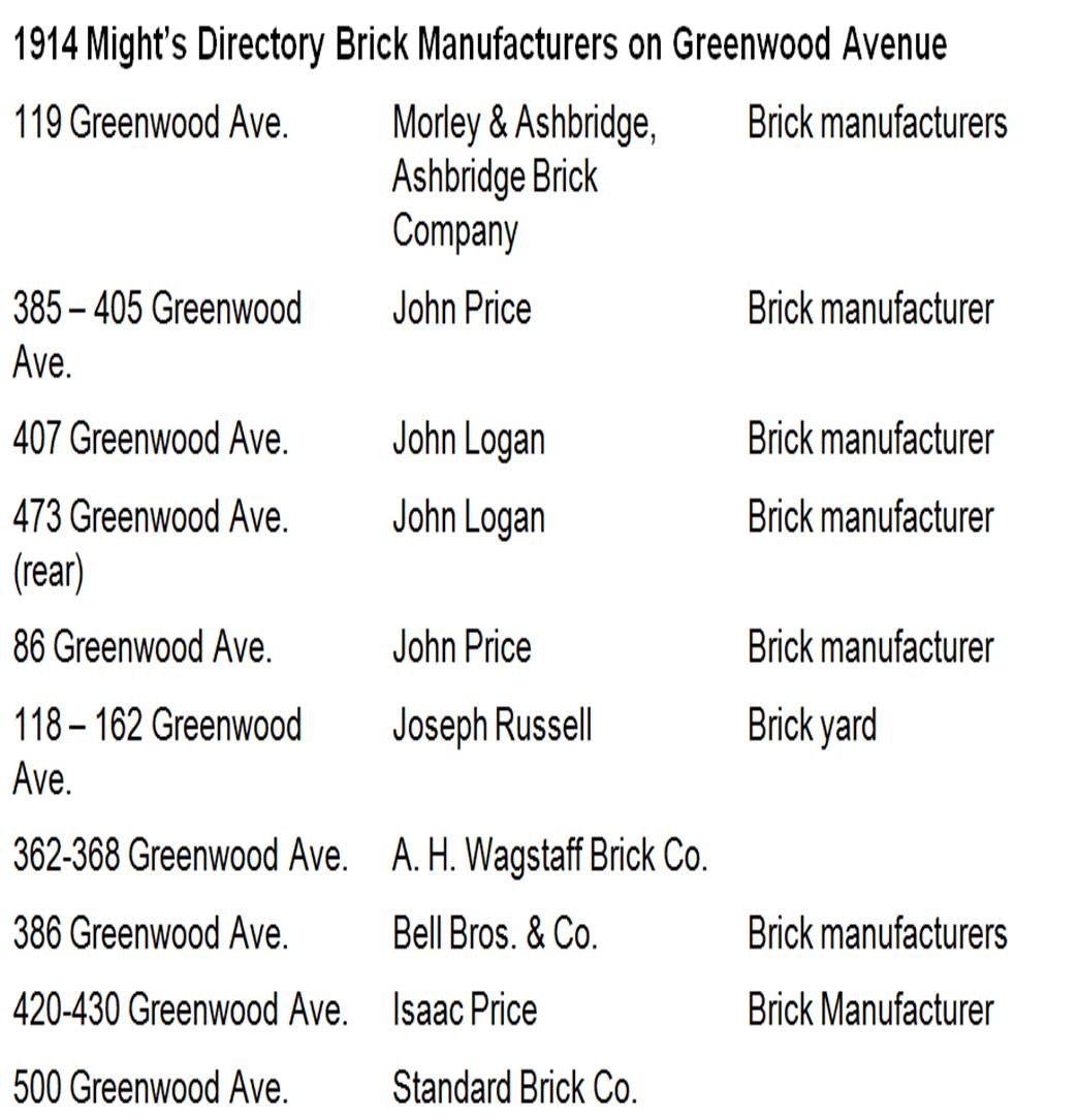 According to the 1921 Might’s Directory, Joseph Russell still remained in business at 40 Blake. He had sold his Greenwood Avenue brickyards for housing: Alton, Sawden, Stanton, etc. Along Greenwood Avenue there were: A. H. Wagstaff, 302 Greenwood Ave. and 336 Greenwood Ave.; Price & Smith, 386 – 436 Greenwood Ave.; John Price, Ltd., 395 Greenwood Ave.; Standard Brick Co., 460 Greenwood Ave.; and John Logan, 471 Greenwood Ave. (Might’s Directory 1921, 282 – 283) This was far fewer than ever before.