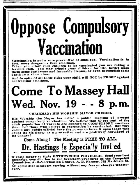 Anti Vaccination League, Toronto Star, November 18, 1919 Dr. Hastings, the City’s Chief Medical Officer of Health, supported compulsory vaccination