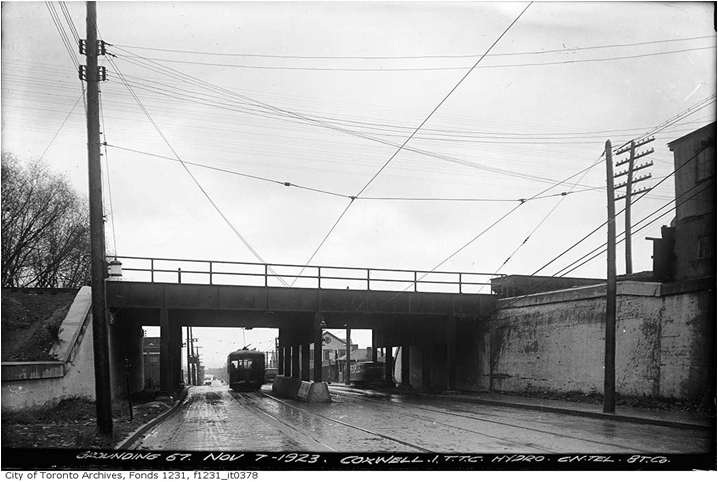 Previous Image Next Image Ashdale underpass Streetcar passing through the new underpass, Coxwell Avenue, City of Toronto Archives.