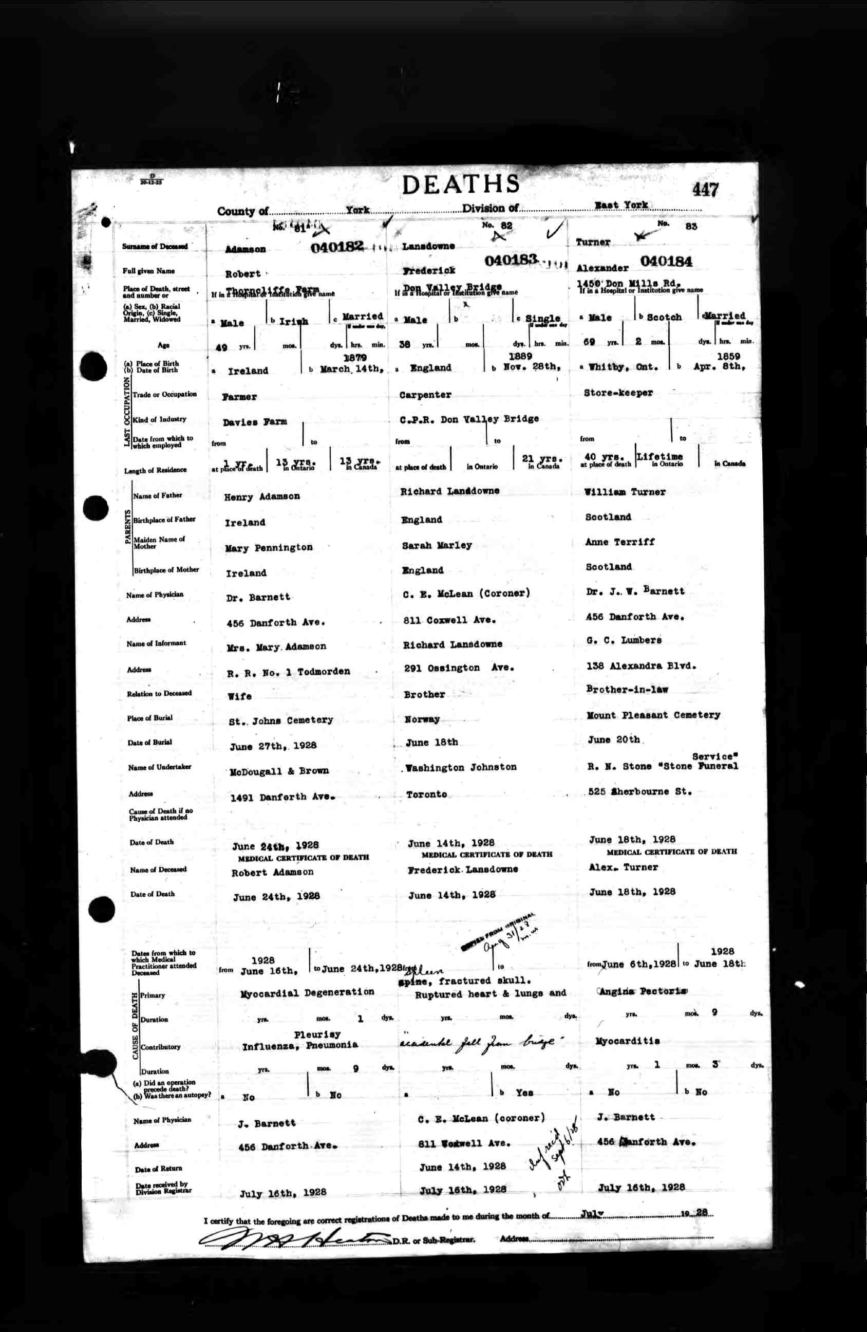 Death certificate Frederick Lansdowne
