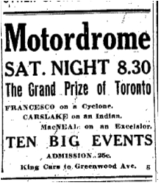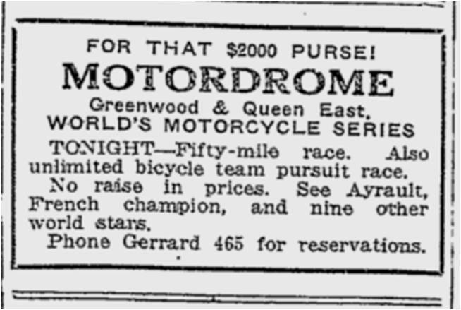 THE SPORT OF THRILLS AND SPEED! MOTORDROME GREENWOOD AND QUEEN EAST. THREE BIG FEATURE MEETS TO-NIGHT and DOM. DAY (Afternoon and Night). TO-NIGHT – 45-mile Motorcycle Handicap. HOLIDAY MATINEE – Thrilling Free-For-All. WEDNESDAY NIGHT – 25 mile grind with seven demons. Ladies free Tuesdays if accompanied. Children half-price. 3,000 25c seats. Toronto Star, June 30, 1914FOR THAT $2000 PURSE! MOTORDROME Greenwood & Queen East. WORLD’S MOTORCYCLE SERIES TONIGHT – Fifty-mile race. Also unlimited bicycle team pursuit race. No raise in prices. See Ayrault, French champion, and nine other world stars. Phone Gerrard 465 for reservations. Toronto World, July 15, 1914