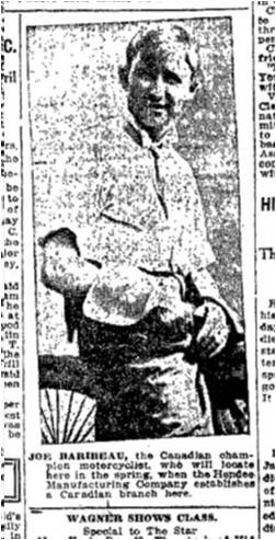 JOE BARIBEAU, the Canadian champion motorcyclist, who will locate here in the spring, when the Hendee Manufacturing company establishes a Canadian branch here.
