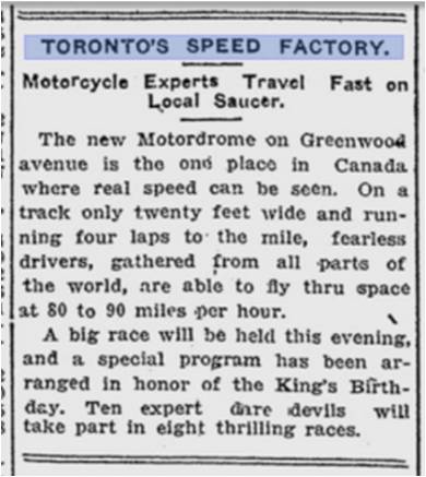 Toronto Star, May 7, 1914MOTORDROME GRAND OPENING May 23 8:30 p.m. and May 25 8:30 p.m. Star Riders From All Parts of the World Will Appear Limited Number of Reserve Seat Tickets at Moodey’s, 33 King. W. Main 1417 PRICES 25c, 50c, 75c Toronto Star , May 20, 1914