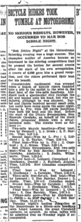 “Bob Dibble Night” at the Motordrome Saturday evening was a huge success. The campion sculler of America became so interested in the stirring competitions that he pressed the button for several events after the start of his own sweepstakes. A crowd of 6,000 gave him a grand reception, and the riders performed their best for his benefit.