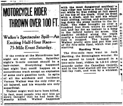 If the events at the Motordrome last night are any criterion, Saturday night’s 75-mile contest should be a hair-raiser. Everything happened last night that could happen on a Motordrome track except an explosion of some one’s gasoline tank. In spite of all the accidents and incidents Vernon Walker was the only rider at all injured, and his wounds are only superficial.