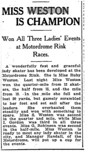 A wonderfully fast and graceful lady skater has been developed at the Motordrome Rink. She is Miss Ruby Weston. last night Miss Weston won the quarter-mile from 12 skaters, the half from 15, and the mile from 19. In the mile she fell and lost 50 yards, but gamely scrambled to her feet and set sail after the leaders. She overhauled them steadily and won with something to spare. Miss. S. Weston was second in the quarter and mile, while Miss I. Gordon was third in all three events. Miss G. Robinson was second in the half-mile. Miss Weston is ready to meet any lady skater in the city, and Mange Randall, of the Motordrome, will put up a cup for the events.