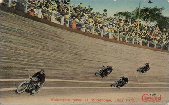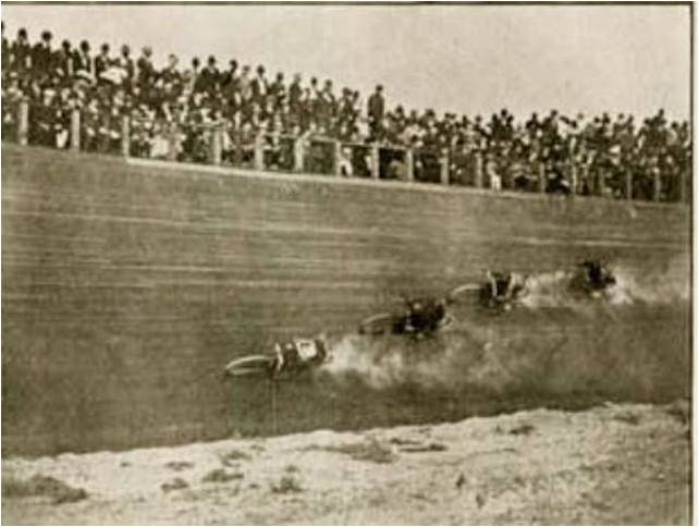 The crowd was drawn by the sport and the danger. Motorcycles and bicycles raced on circular or oval race courses made of wooden planks. When motorcycle raced on them they were called “motordromes”; when bicycles raced on them they were called “velodromes”. Cycling was thrilling too, but the crashes were rarely lethal.