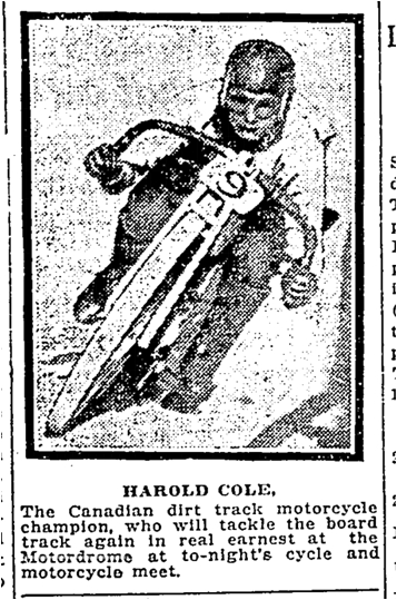 McFarland Stabbed to DeathAll Sorts of Sport. Vol. XV, Issue 778, May 28, 1915, Page 23HAROLD COLE The Canadian dirt track motorcycle champion, who will tackle the board track again in real earnest at the Motordrome at to-night’s cycle and motorcycle meet. Toronto Star May 29 1915Toronto Star, June 2, 1915