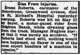 Ernest Roberts, caretaker of the Motordrome, Greenwood avenue, died in St. Michael’s Hospital yesterday morning. Roberts was hit on May 22 by Sayer, a motor-paced rider from Bright Beach, while cleaning glass from the track. Manager Hughes stated that it was purely an accident. “If Roberts had stood still, nothing would have happened, as Sayer is one of the most expert handlers of a machine in America.”