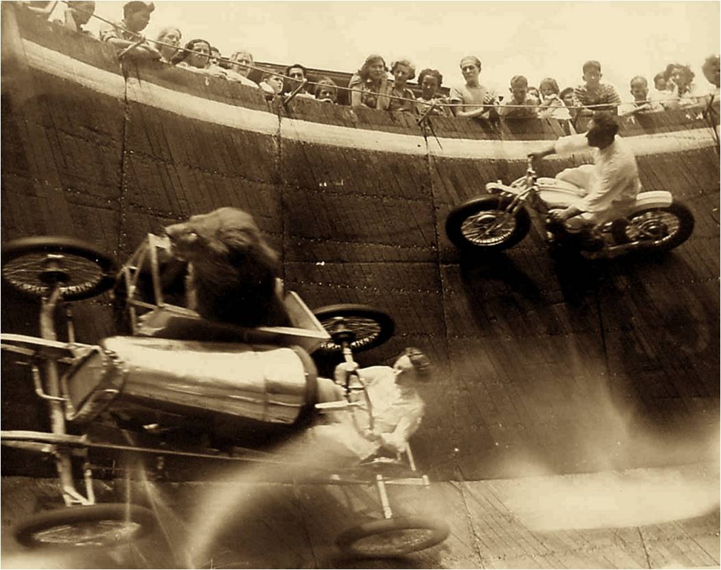 Bicycle race at Velodrome, Scarboro Beach Park, c. 1926The Motordromes all disappeared and, while motorcycle racing continued on more conventional tracks, the wall of death lived on as sideshow attraction in the circus. The Wall of Death, Revere Beach, MA, c. 1929http://selvedgeyard.com/2009/12/05/the-wall-of-death-daredevils-lions-riders-fairs-oh-my/ accessed Feb. 26, 2016BillBoard, Aug. 18, 1948